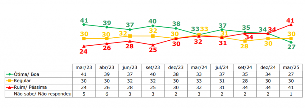 Já em ‘“avaliação“, apenas 6% da Região Norte classificou o governo como “ótimo“, e 29% como “péssima“. Em 2024, “ótimo” aparecia com 8%, e “péssimo” com 20%.