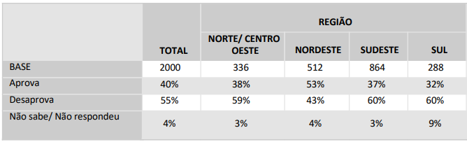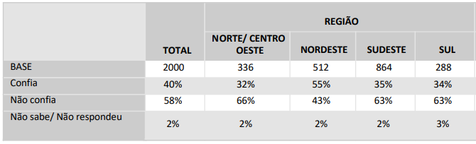 Em relação ao Norte, o crescimento foi de 10% em comparação à última avaliação publicada pelo Instituto Inteligência em Pesquisa e Consultoria Estratégica (Ipec), em dezembro de 2024, quando o percentual de desconfiança na região era de 56%.