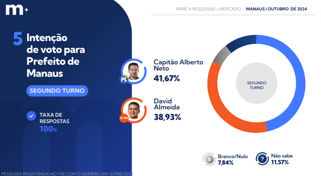 MANAUS (AM) – Candidato do PL a prefeito de Manaus (AM), Alberto Neto lidera o primeiro levantamento do Instituto Marca Pesquisas do segundo turno da eleição no município, com 51,7% dos votos válidos, contra o atual prefeito, David Almeida (Avante), com 48,3%.