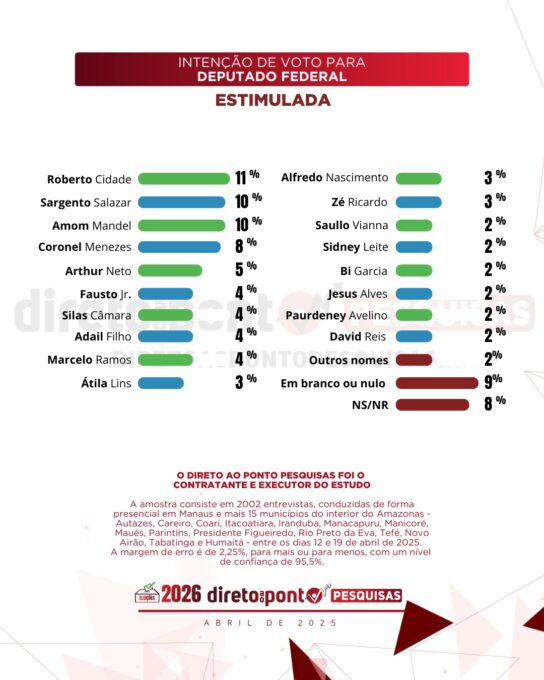 MANAUS (AM) – O primeiro levantamento de 2025 realizado pelo instituto Direto ao Ponto Pesquisas revelou os nomes mais competitivos na disputa pelas dez vagas que o Amazonas terá na Câmara dos Deputados em 2026 — e trouxe uma novidade significativa: Roberto Cidade (União Brasil) aparece na liderança, com 11% das intenções de voto, despontando como principal nome na corrida.