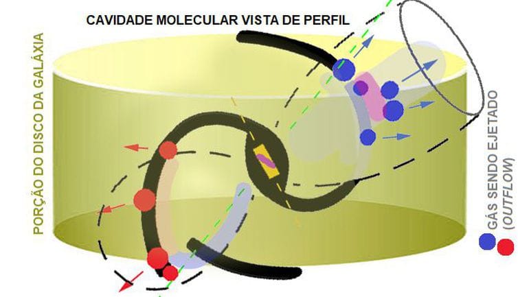 “Seria uma bolha em expansão. A parte da bolha que enxerga o núcleo [atingida pela radiação] ficaria com uma temperatura maior e uma velocidade maior. E a parte mais fria, que está na sombra, também está expandida, porque faz parte da mesma coisa, só que a gente vê de uma forma diferente, como a fase molecular. Se você tem temperaturas menores, você tem moléculas”, diz.
