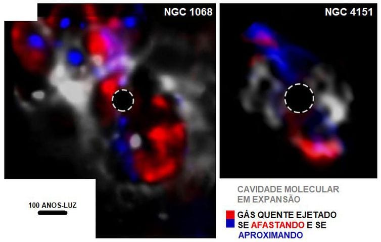 Segundo May, costumava se pensar que a parte mais fria era o gás que estava sendo atraído pela força da gravidade do buraco negro. Porém, a partir da observação de duas galáxias relativamente próximas – a NGC 1068 e a NGC 4151 – o pesquisador diz que tudo faz parte de uma espécie de bolha de matéria que está sendo ejetada pelo buraco negro.