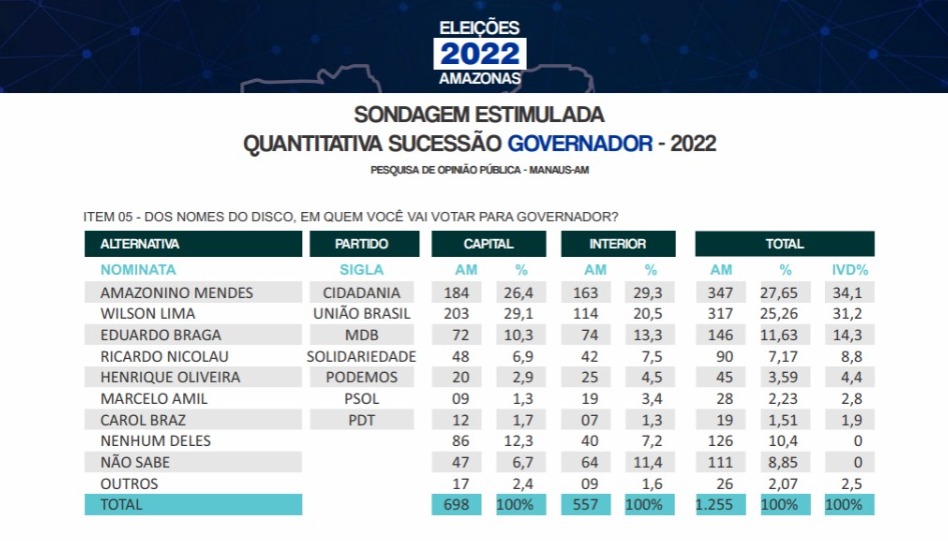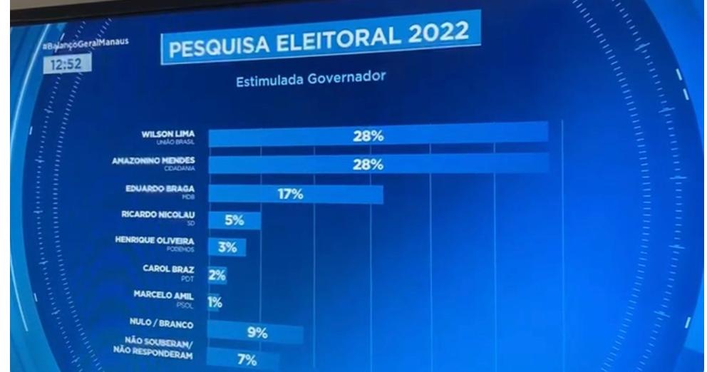 A mesma pesquisa de número 04178/2022 registrada no Tribunal Regional Eleitoral do Amazonas (TRE-AM) apontou que, na capital, Wilson Lima liderava a corrida eleitoral, com 29,1%, seguido de Amazonino com 26,4%.
