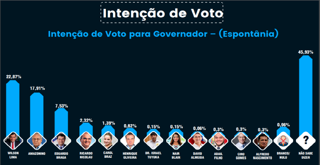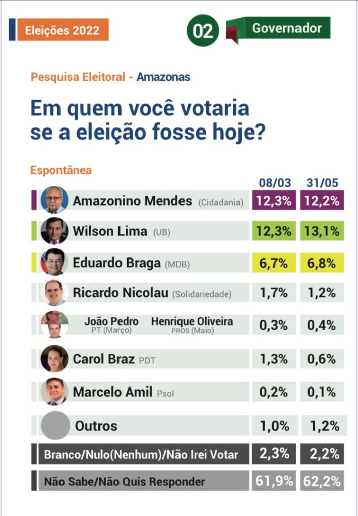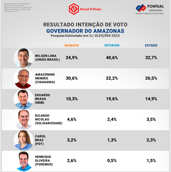 No último dia 4 de setembro, o Instituto Pontual divulgou o resultado da pesquisa para as Eleições de 2022 em que apontou que Wilson Lima (União) alcança 32,7% das intenções de voto, seguido por Amazonino Mendes (Cidadania) com 26,5%. Em terceiro colocado está Eduardo Braga (MDB), com 14,9%. Na quarta colocação, Ricardo Nicolau (Solidariedade) obteve 3,5%, seguido por Carol Braz (PDT), com 2,3%, e Henrique Oliveira (Podemos) com 1,5%.