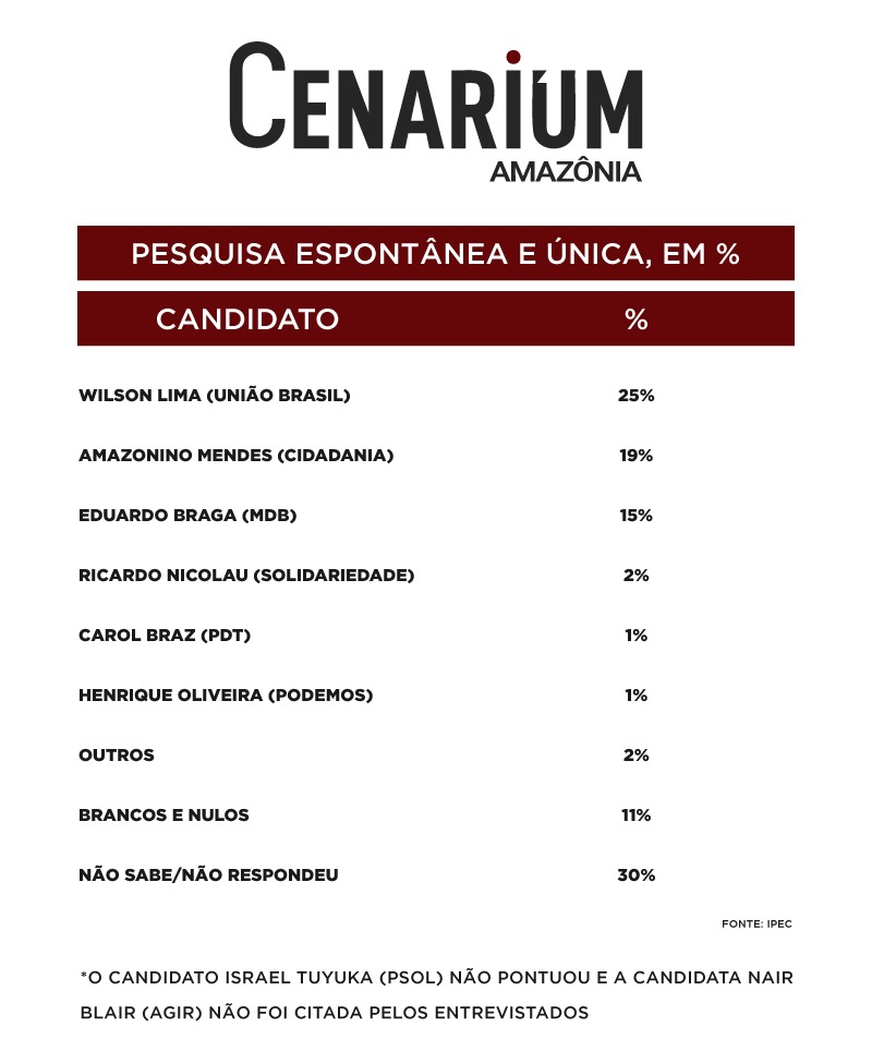 Já em 24 de agosto, um levantamento do Instituto de Inteligência em Pesquisa e Consultoria Estratégica (Ipec), divulgado pela Rede Amazônica, aponta que o atual governador do Amazonas, Wilson Lima (União), abriu seis pontos de vantagem sobre o candidato Amazonino Mendes (Cidadania). Na pesquisa espontânea, Wilson foi citado por 25% do público, já Amazonino foi a escolha de 19%.
