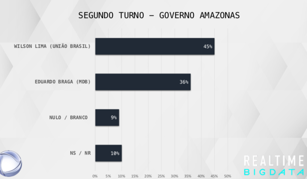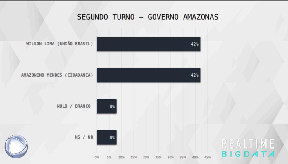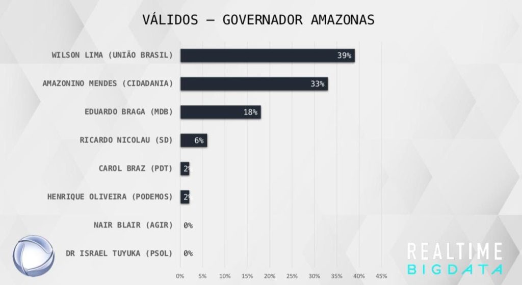 No cenário de votos válidos apontado pelo levantamento do Big Data, Wilson Lima mantém a liderança na corrida eleitoral, com seis pontos à frente do segundo colocado, Amazonino Mendes (Cidadania) que tem 33%.