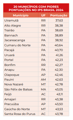 Além de Uiramutã, Alto Alegre, também em Roraima, e Trairão, no Pará, estão entre os piores índices apresentados. O Estado do Pará é o mais frequente na tabela, com oito municípios indicados no ranking dos 20 índices mais baixos. No Amazonas, o município de Pauini, localizado a 923 quilômetros da capital Manaus aparece na 13ª posição. Veja abaixo: