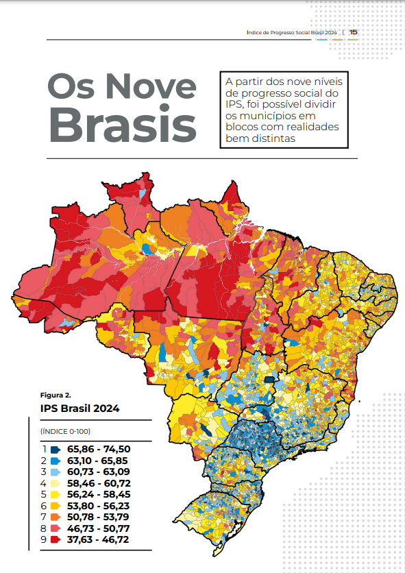 O Índice de Progresso Social (IPS) Brasil 2024 registrou uma pontuação de 61,83 para o País. Entre as dimensões avaliadas, Necessidades Humanas Básicas obteve 73,58, Fundamentos do Bem-estar alcançou 67,10, e Oportunidades ficou com 44,83. O IPS se baseia em indicadores exclusivamente sociais e ambientais, sem incluir indicadores econômicos, para medir diretamente o progresso socioambiental. Ele foca nos resultados que afetam a vida das pessoas, avaliando as desvantagens ao invés das vantagens.