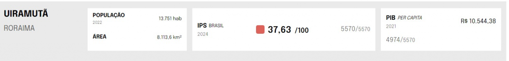 MANAUS (AM) – O último relatório do Índice de Progresso Social (IPS) divulgado este ano indica que o município de Uiramutã, em Roraima, registra a menor pontuação em qualidade de vida no País, alcançando 37,63. Situada a 360 quilômetros de Boa Vista, na região Norte do país, com uma população de 13.751 habitantes, a cidade enfrenta significativas dificuldades em termos de habitação, educação e saúde.