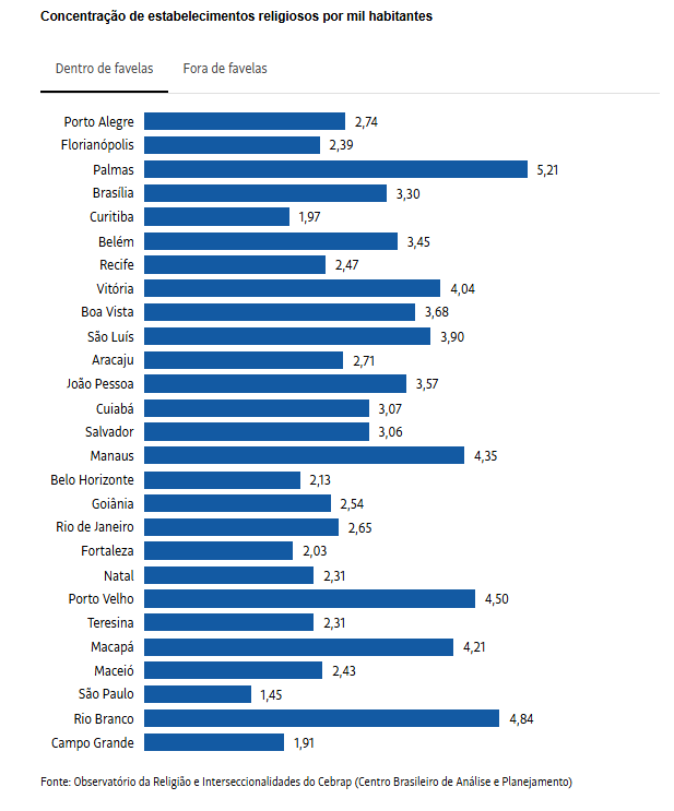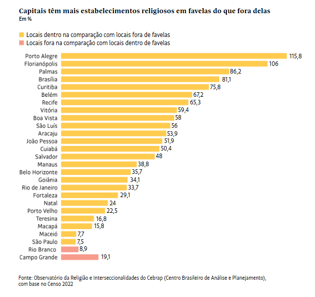 Isso é fato em 25 das 27 capitais brasileiras. Esse cálculo considerou a proporção de templos por mil habitantes dentro das favelas e fora delas em cada um dos municípios.