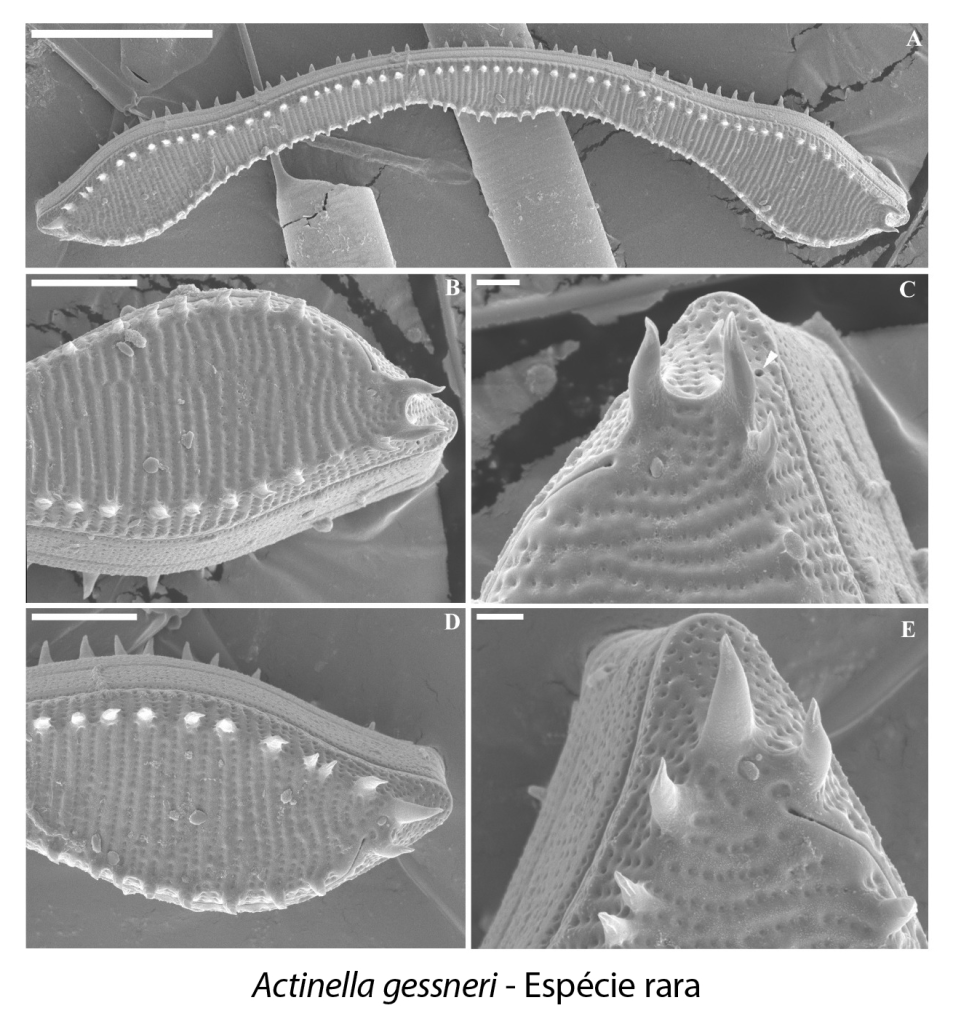 Já o trabalho publicado em fevereiro de 2024, na Phytotaxa, revista científica que publica sobre botânica, e se concentra na publicação de novas espécies, documenta o registro da espécie endêmica amazônica Actinella gessneri Hustedt, que não era encontrada no ambiente desde 1965. O estudo contou com a participação do egresso do curso de Zootecnia João Marcos Coêlho, da aluna de iniciação científica Camila Carime e da professora Thelma Ludwig, da Universidade Federal do Paraná (UFPR). “A Actinella gessneri Hustedt foi descrita em 1965 para a bacia do rio Tapajós e bacia do Rio Negro. E, desde então, esta espécie não foi mais vista. Nós a encontramos no rio Uaicurapá, em Parintins, no Amazonas”, comenta a professora Angela Lehmkuhl.