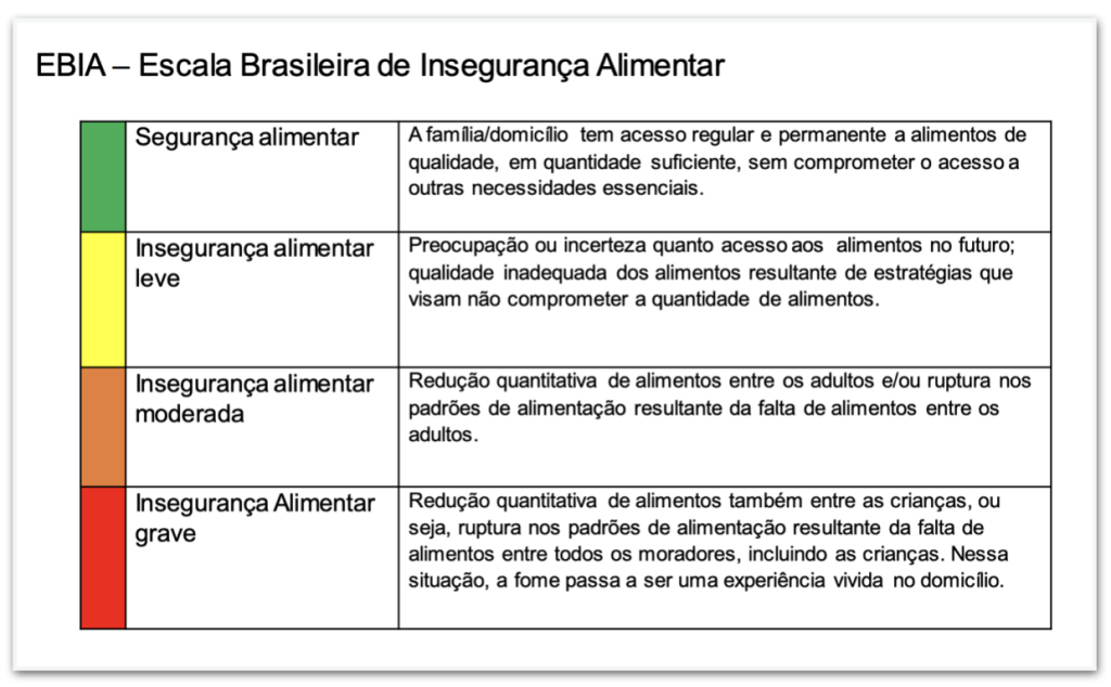 De acordo com a Escala Brasileira de Insegurança Alimentar (Ebia), usada pela Rede Penssan e pelo Instituto Brasileiro de Geografia e Estatística (IBGE), insegurança alimentar é quando a pessoa não tem acesso regular a alimentos. O indicador é dividido em três níveis: leve, moderado e grave.