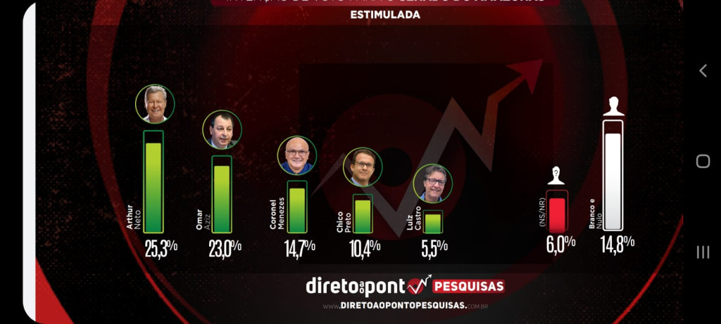 Segundo dados da pesquisa quantitativa (coleta de informações de natureza numérica analisadas por métodos estatísticos) realizada pelo Direto ao Ponto Pesquisas, logo após Arthur Virgílio Neto, o nome de Omar Aziz (PSD) aparece com 23%, seguido de Coronel Menezes (PL) com 14,7% das intenções, Chico Preto (Avante) marcando 10,4% e Luiz Castro (PDT) citado com 5,5% das intenções dos votos.