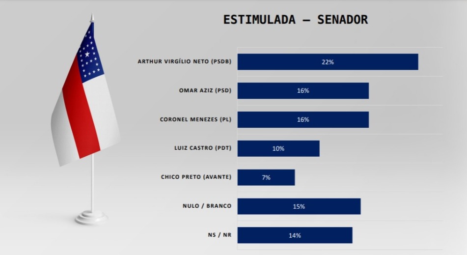 Em pesquisa estimulada (quando são apresentados, ao entrevistado, opções de candidatos), o Big Data mostra que Arthur deixa para trás nomes como Omar Aziz (PSD) e Coronel Menezes (PL), ambos com 16% das citações; Luiz Castro (PDT) com 10% e Chico Preto (Avante) com 7%.