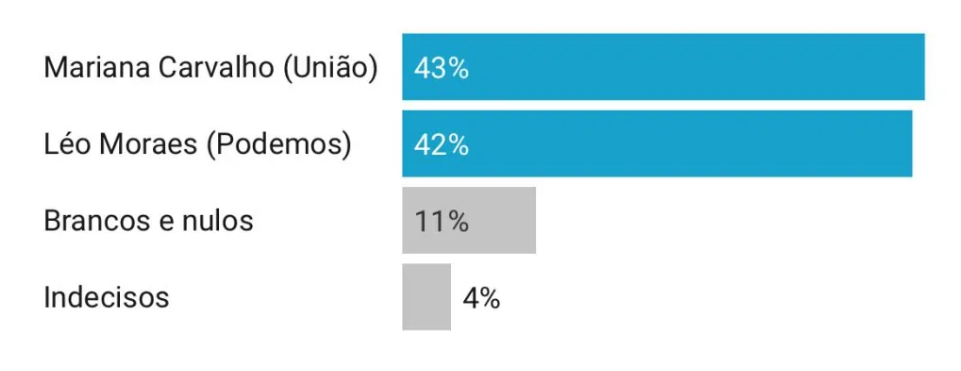 A mais recente pesquisa eleitoral divulgada nessa terça-feira, 22, pelo Instituto Amazônia de Pesquisa (IAPE) aponta Léo Moraes liderando a disputa com 54% das intenções de votos, contra 37,2% de Mariana Carvalho. O levantamento foi realizado entre os dias 17 e 19 de outubro e tem margem de erro de 3,8% e nível de confiança de 95%. O número de registro da pesquisa junto ao Tribunal Regional Eleitoral de Rondônia (TRE-RO) é RO-07306/2024.