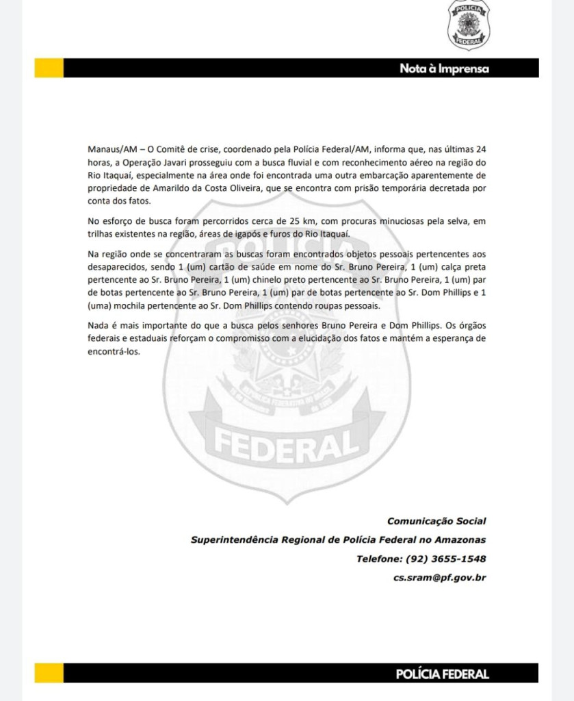 Ainda segundo o documento, o Comitê de Crise, coordenado pela PF-AM, informou que a Operação Javari prosseguiu, nas últimas 24 horas, com a busca fluvial e com reconhecimento aéreo na região do Rio Itaquaí, na área onde foi encontrada uma outra embarcação.
