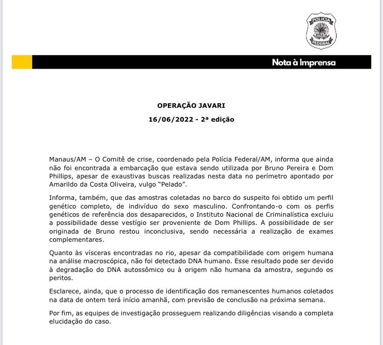 No documento, o órgão policial destacou, ainda, que o processo de identificação dos remanescentes humanos coletados na quarta-feira, 15, terá início nesta sexta-feira, 17, com previsão de conclusão na próxima semana. Equipes de investigação, salienta a PF-AM, seguem realizando diligências na região de buscas para a elucidação completa do caso.