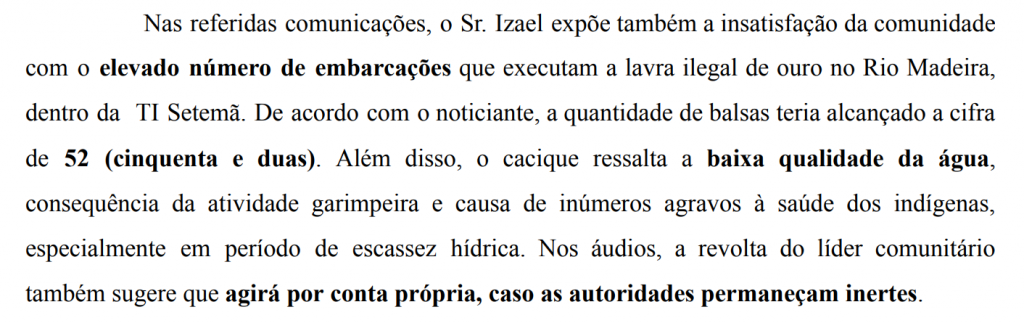 Nos áudios enviados ao procurador da República, a liderança da Terra Indígena Setemã denunciou que a quantidade de balsas no local alcançou 52 no total, o que teria provocado doenças aos indígenas que habitam na região, especialmente em período de escassez hídrica. Segundo o MPF, no material enviado ao órgão, o representantes da comunidade “sugere que agirá por conta própria, caso as autoridades permaneçam inertes”. Veja trecho do documento: