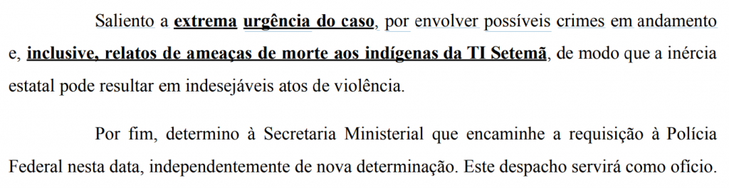 “Saliento a extrema urgência do caso, por envolver possíveis crimes em andamento e, inclusive, relatos de ameaças de morte aos indígenas da TI Setemã, de modo que a inércia estatal pode resultar em indesejáveis atos de violência”, escreveu a autoridade do MPF no documento que foi enviado à PF do Amazonas. Veja: