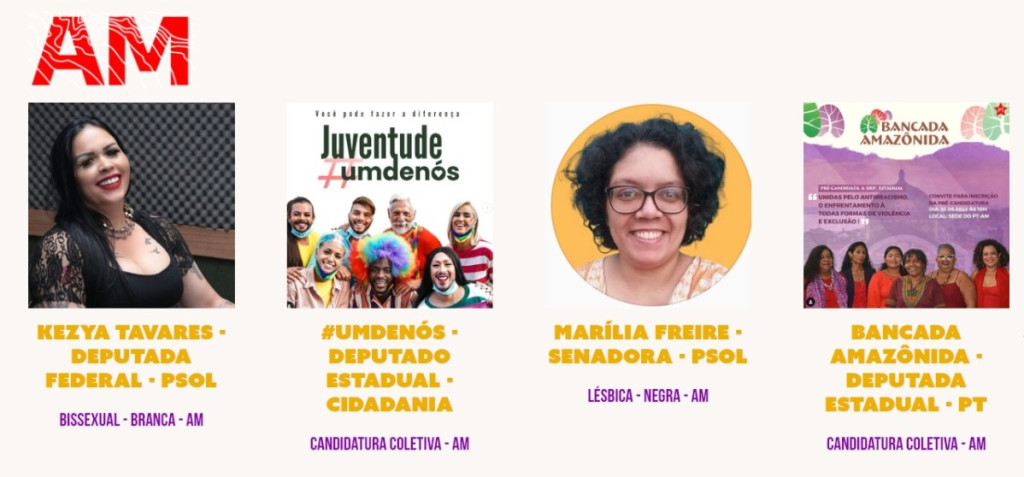 No Amazonas, segundo o levantamento, concorrem ao cargo de deputados estaduais, a Bancada Amazônida, (PT) e o coletivo #umdenós (Cidadania). Para a cadeira de deputada federal, o nome apresentado é o da nutricionista, bissexual e ativista social Kezya Tavares (PSOL); para o Senado, a oficial de Justiça Marília Freire aparece na lista como mulher lésbica negra para dar representatividade.
