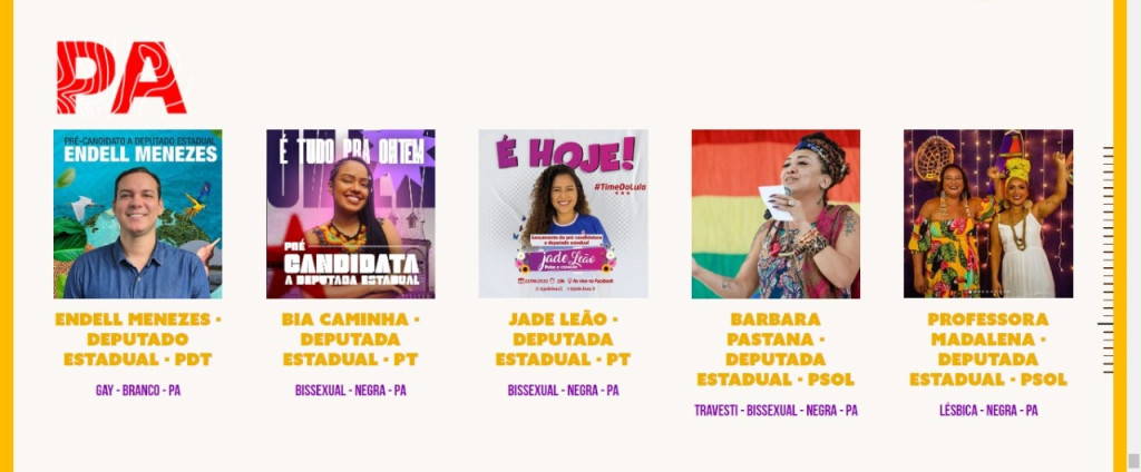 No Pará, o levantamento aponta que todas as candidaturas são para o cargo de deputado estadual, são eles: Endell Menezes (PDT); Barbara Pastana (PSOL), identificada no levantamento como travesti/ bissexual negra; Jade Leão (PT), bissexual negra; professora Madalena (PSOL), lésbica negra e a bissexual Bia Caminha (PT)