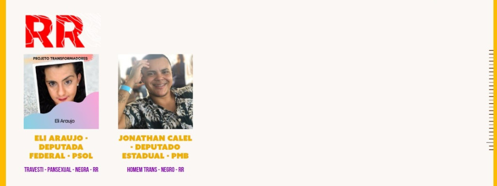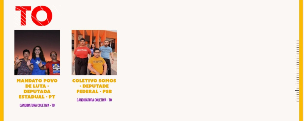Em Tocantins, são duas candidaturas representadas por bancadas coletivas. Para deputada estadual a bancada “Mandato Povo de Luta”, para o cargo de deputad(e) federal a bancada Coletivo Somos (PSB). Roraima também aparece no levantamento com apenas dois nomes, são eles, a travesti pansexual negra Eli Araújo (PSOL) e o homem trans negro Jonathan Calel (PMB). O Acre fecha a listagem com apenas um nome, doutora Michelle Melo (PT), bissexual negra, candidata a deputada estadual.