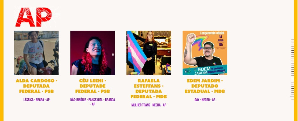 No Amapá, 4 candidaturas foram identificadas até então, uma para deputado estadual e três para federais. O gay negro Edem Jardim (MDB) vem para concorrer ao cargo estadual, a não-binárie e pansexual e branca Céu Leehi (PSB) e a lésbica e negra Alda Cardoso (PSB) disputam uma vaga como deputada federal. Apresentada na pesquisa como mulher trans negra, a candidata Rafaela Esteffans também integra a corrida pelos votos ao cargo.