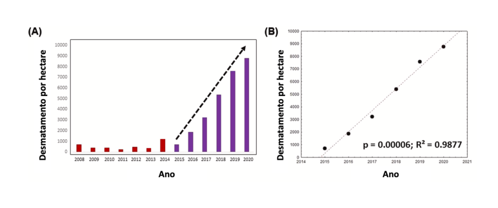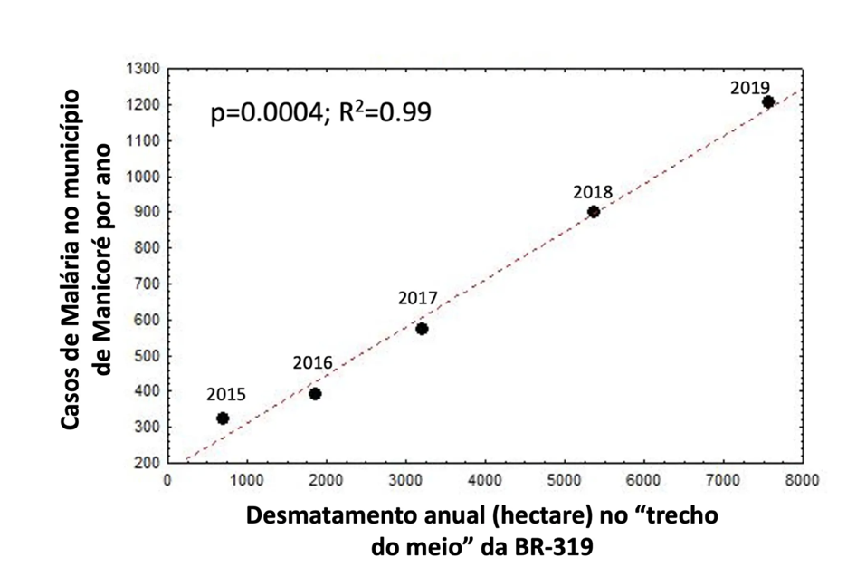 Esse mesmo desmatamento foi responsável pelo aumento de 400% nos casos de Malária na região, um indicador do risco de saltos zoonóticos propiciados pelo desmatamento. Ou seja, mais de uma árvore já foi cortada e a degradação ambiental já tem aumentado endemias na área.