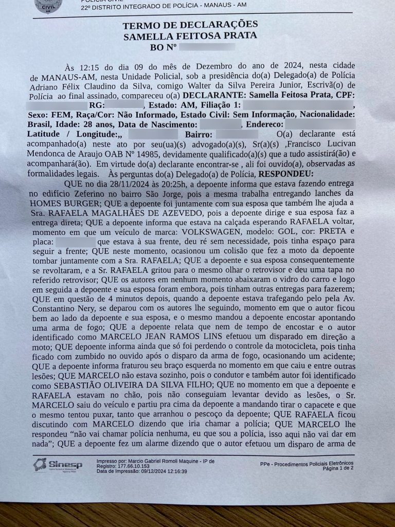“[…] Logo em seguida, a depoente e sua esposa foram embora, pois tinham outras entregas para fazer; QUE em questão de 4 minutos depois, quando a depoente estava trafegando pela Av. Constantivo Nery, se deparou com os autores lhe seguindo […]”, relata Samella no BO. “[…] o mesmo [denunciado] mandou a depoente encostar apontando uma arma de fogo […] nem deu tempo de encostar e o autor, identificado como MARCELO JEAN RAMOS LINS, efetuou um disparo em direção à moto”, conta a entregadora.