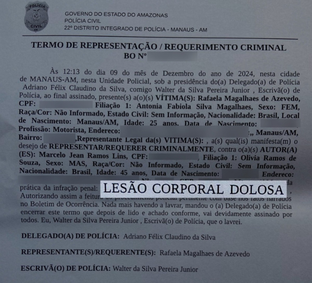 O caso foi registrado como “lesão corporal dolosa”, crime previsto no artigo 129 do Código Penal Brasileiro (CPB).