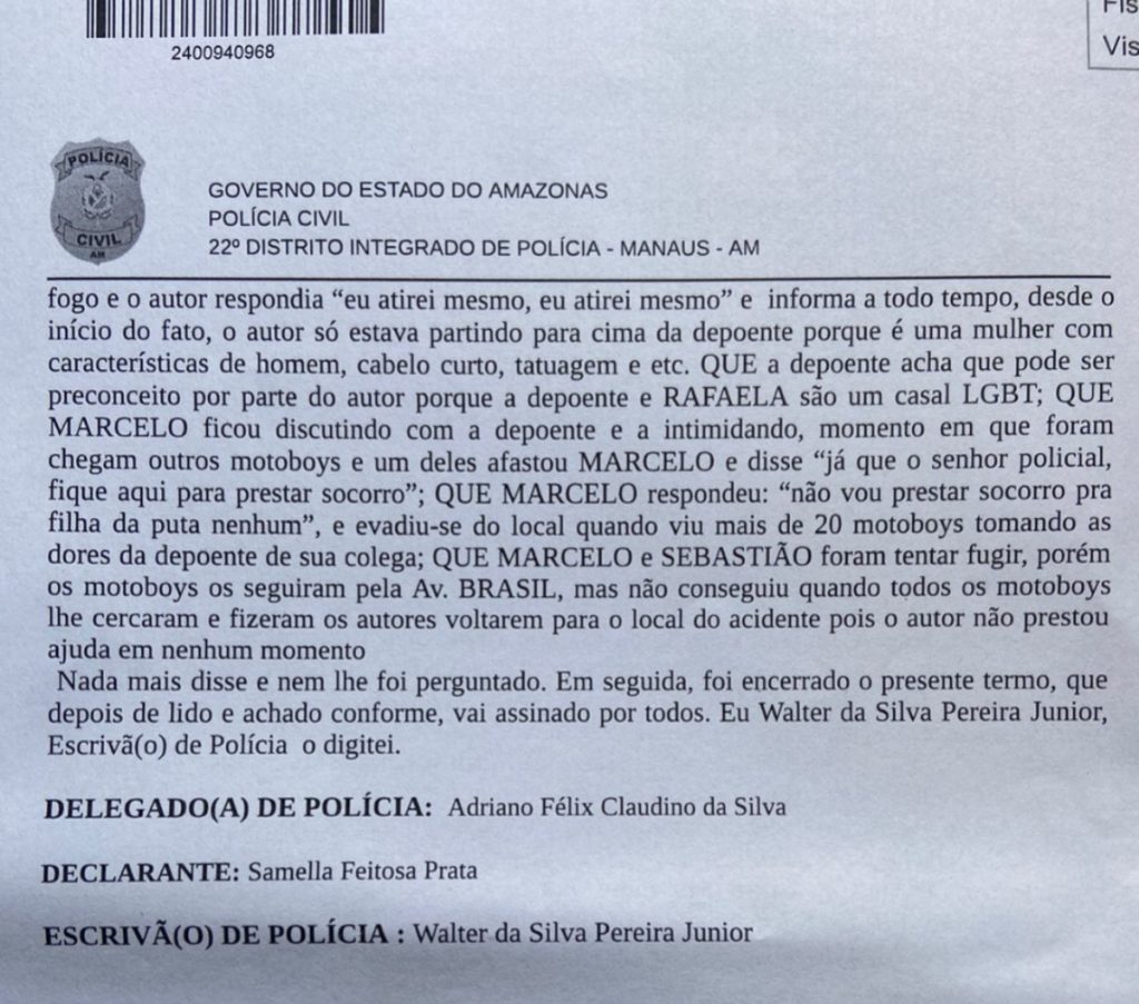 “[…] O autor só estava partindo pra cima da depoente porque ela é uma mulher com características de homem, cabelo curto, tatuagem e etc. QUE a depoente acha que pdoe ser preconceito por parte do autor porque a depoente e RAFAELA são um casal LGBT”, diz o BO.