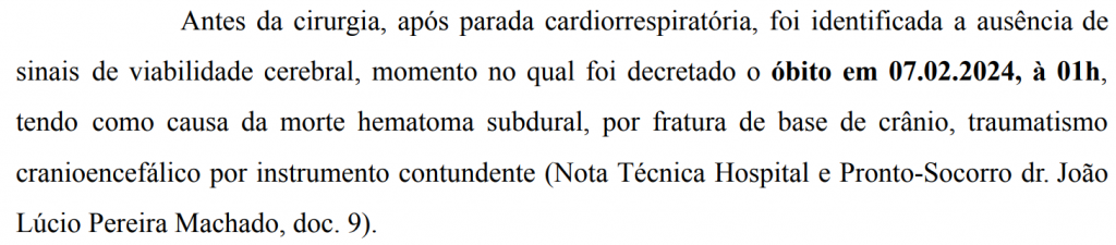 No exame de tomografia computadorizada, a equipe médica do Hospital João Lúcio identificou hematoma subderal, quando acontece um acúmulo de sangue entre o cérebro e o crânio e solicitou intervenção cirúrgica. O procedimento não chegou a ser feito, porque, após o paciente sofrer uma parada cardiorrespiratória, os profissionais identificaram “a ausência de sinais de viabilidade cerebral”. A morte de Tadeo Kulina foi confirmada às 1h da madrugada de 7 de fevereiro de 2024.