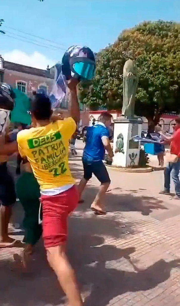 Nas imagens, um dos apoiadores de Jair Bolsonaro batem em rivais políticos com a ajuda de um capacete de motocicleta.