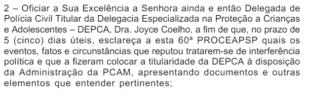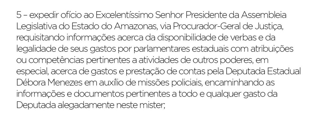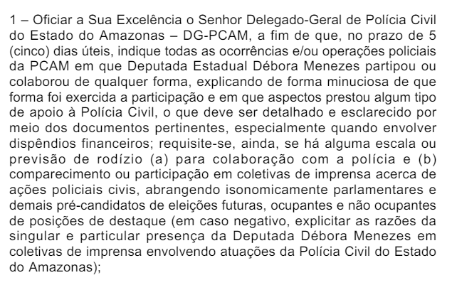 “Oficiar a Sua Excelência o Senhor Delegado-Geral de Polícia Civil do Estado do Amazonas – DG-PCAM, a fim de que, no prazo de 5 (cinco) dias úteis, indique todas as ocorrências e/ou operações policiais da PC-AM em que Deputada Estadual Débora Menezes participou ou colaborou de qualquer forma, explicando de forma minuciosa de que forma foi exercida a participação e em que aspectos prestou algum tipo de apoio à Polícia Civil (…)“, diz um trecho do documento.