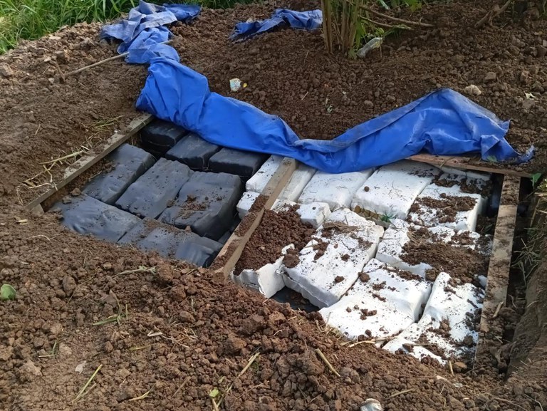 Segundo a corporação, as investigações preliminares e a realização de diligências complementares para confirmação das primeiras informações foram fundamentais para a localização da droga (maconha tipo skunk, pasta base de cocaína e cloridrato de cocaína), que estavam escondidas em uma casa e enterradas na área de mata atrás da residência.