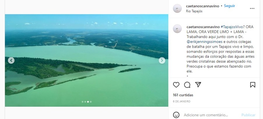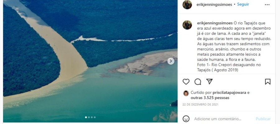 “O rio Tapajós que era azul esverdeado agora em dezembro já é cor de lama. A cada ano a ‘janela’ de águas claras tem seu tempo reduzido. As águas turvas trazem sedimentos com mercúrio, arsênio, chumbo e outros metais pesados altamente lesivos a saúde humana, a flora e a fauna”, publicou, no Instagram.