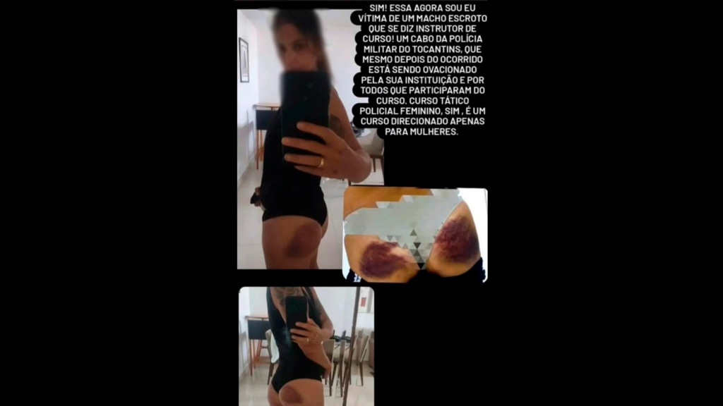 “Essa sou eu, vítima de um macho escroto que se diz instrutor de curso. Um cabo da Polícia Militar de Tocantins que, mesmo depois do ocorrido, está sendo ovacionado pela sua instituição e por todos que participaram do curso”, escreveu a vítima.