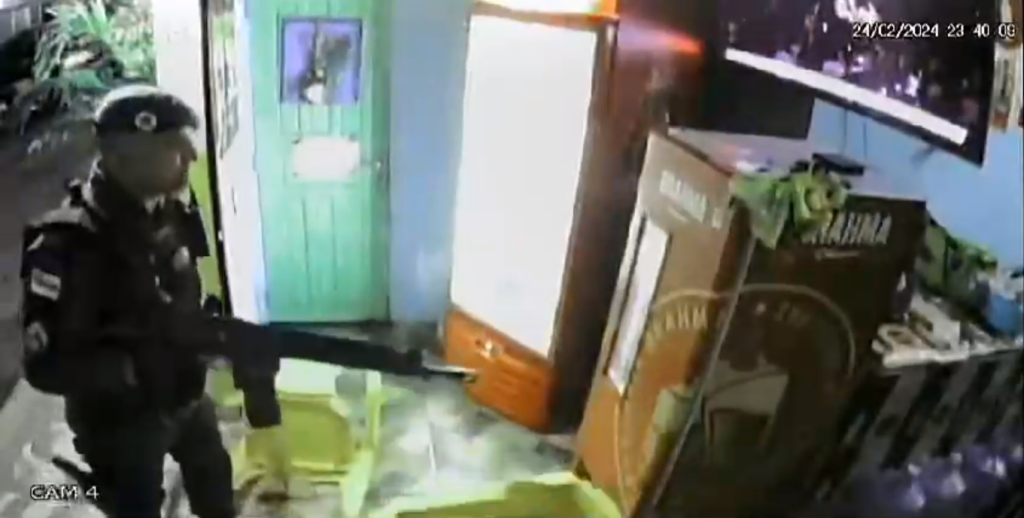 Nas imagens das câmeras de segurança, o policial se irrita e aponta o fuzil para o rosto de um homem de camiseta branca, após agredi-lo. Em outro vídeo, o PM aparece quebrando cadeiras e mesas de plástico na entrada do estabelecimento.