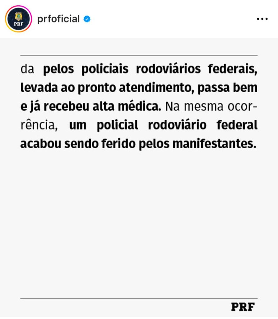“Tivemos três viaturas alvejadas e um colega foi ferido, mas, ele está bem. Sobre a estrutura do acampamento ele comentou. “Nossa inteligência já fez o levamento das lideranças e já estamos acionando a Policia Federal e o Ministério Público Federal tomando ações para as cautelares de prisão”, informou Cristiano. Sobre confrontos em outras regiões, Vasconcellos comentou. “Tivemos essa reação no Pará e em Rio do Sul em Santa Catarina, onde tivemos dois colegas feridos e efetuamos a prisão de um manifestante”, finalizou o agente federal.