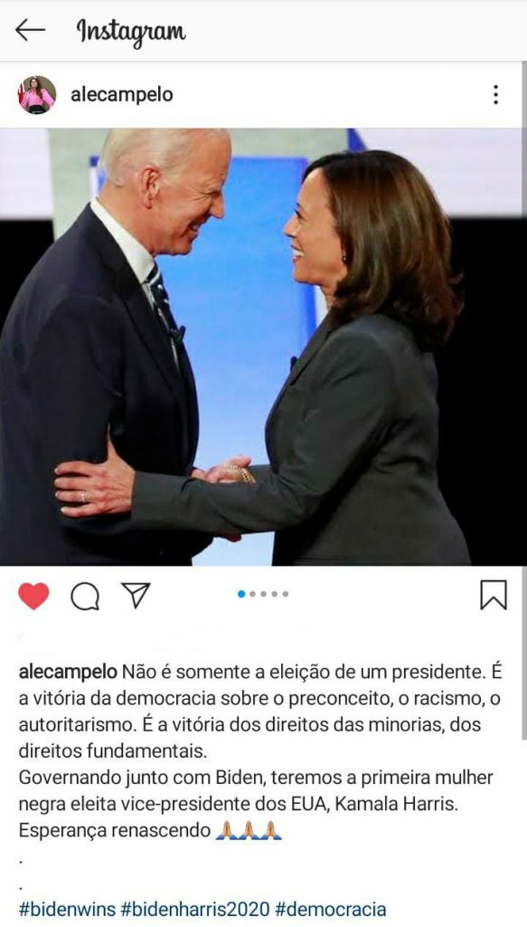 A deputada estadual Alessandra Campelo (MDB) também usou as redes sociais para comentar sobre o resultado da eleição americana. Em uma publicação no Instagram, a parlamentar desabafou: “não é somente a eleição de um presidente. É a vitória da democracia sobre o preconceito, o racismo, o autoritarismo. É a vitória dos direitos das minorias, dos direitos fundamentais.