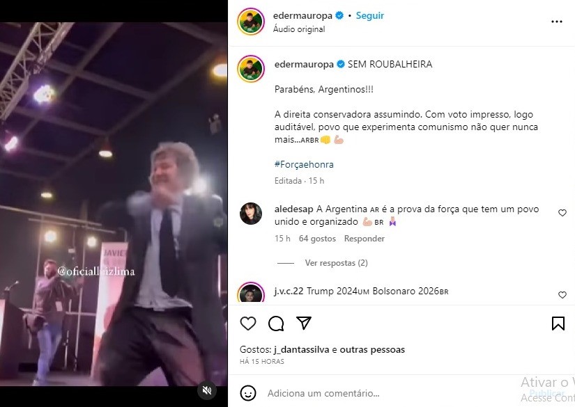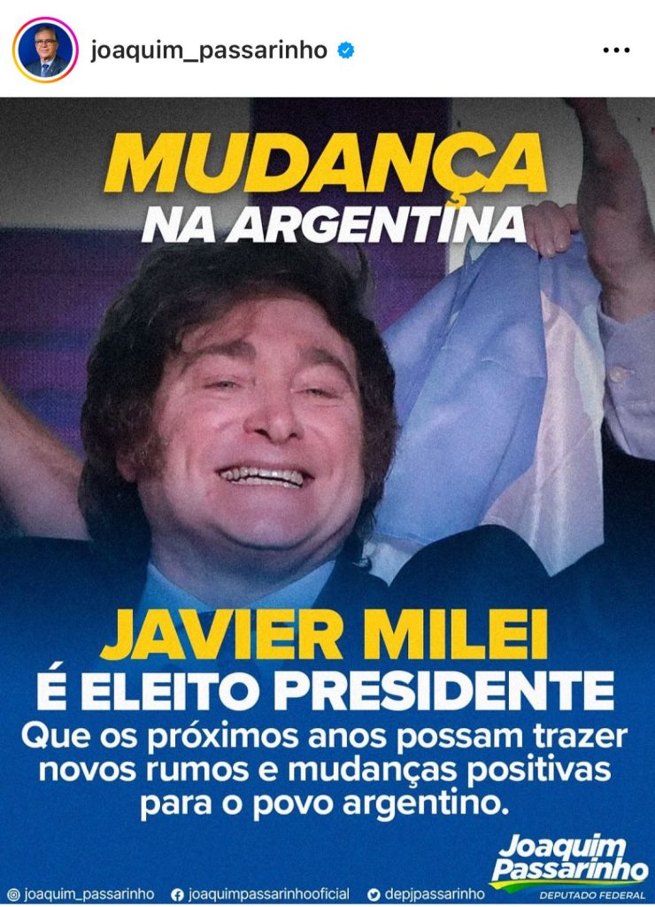“A mudança chegou! Javier Milei conquista a presidência da Argentina, em um pleito histórico. O povo busca por melhorias e progresso”, comentou o deputado de direita Joaquim Passarinho (PL).