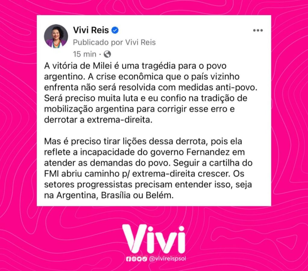 “É preciso tirar lições importantes dessa derrota, pois ela reflete a incapacidade do governo Fernandez em atender as demandas do povo. Seguir a cartilha do FMI [Fundo Monetário Internacional] abriu caminho para a extrema-direita crescer. Os setores progressistas precisam entender isso, seja na Argentina, Brasília ou Belém”, afirmou.