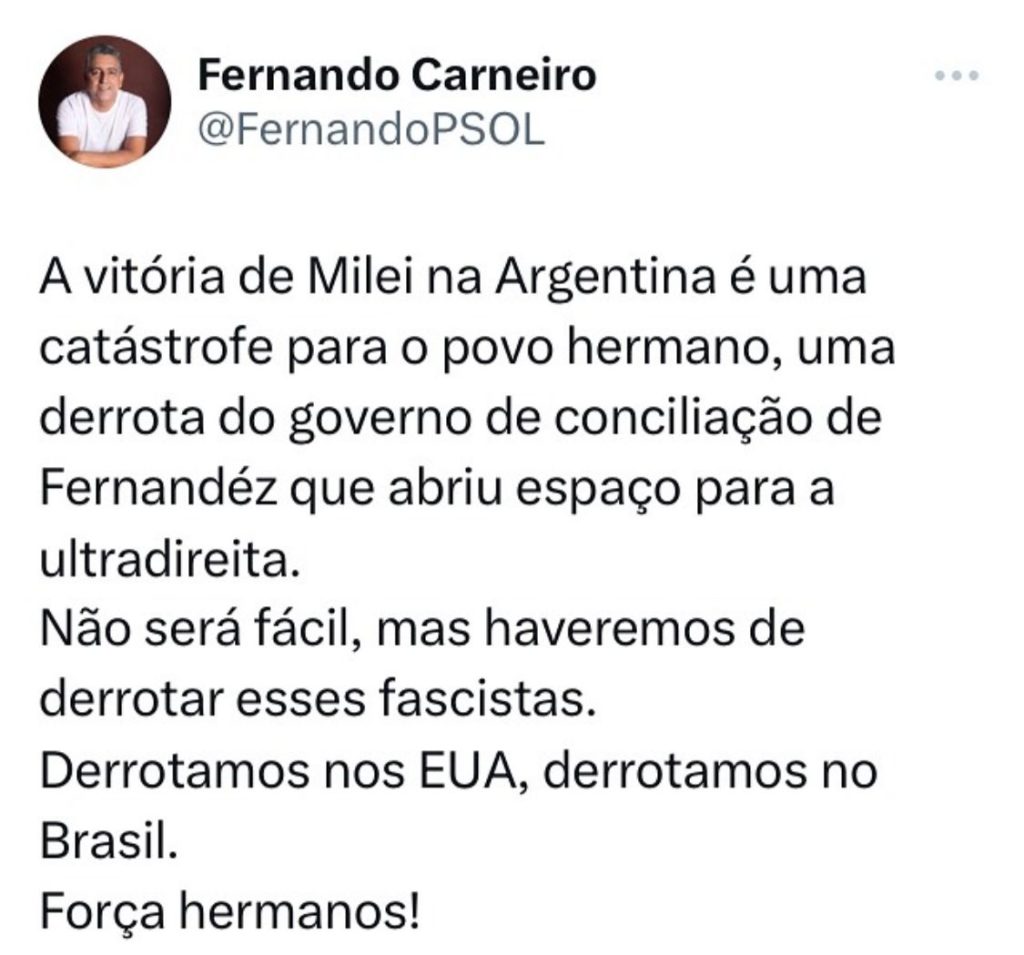 O vereador de Belém Fernando Carneiro (Psol) declarou que os próximos anos não serão fáceis para o povo da Argentina. “A vitória de Milei na Argentina é uma catástrofe para o povo hermano, uma derrota do governo de conciliação de Fernandéz que abriu espaço para a ultradireita”, lamentou.