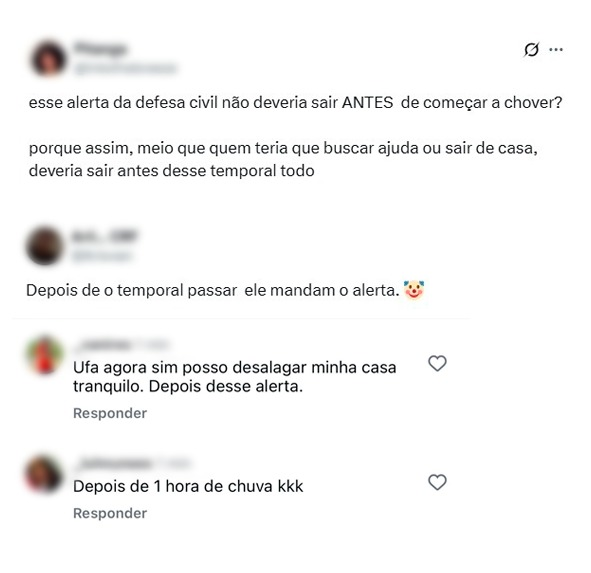 “Muito legal ter chegado o alerta da prefeitura depois de já ter caído meio mundo e alagado tudo”, ironizou uma usuária. Outros comentários resumiram o sentimento geral: “Simmm”, respondeu uma pessoa, enquanto outra observou que “depois do temporal, o alerta chega”.