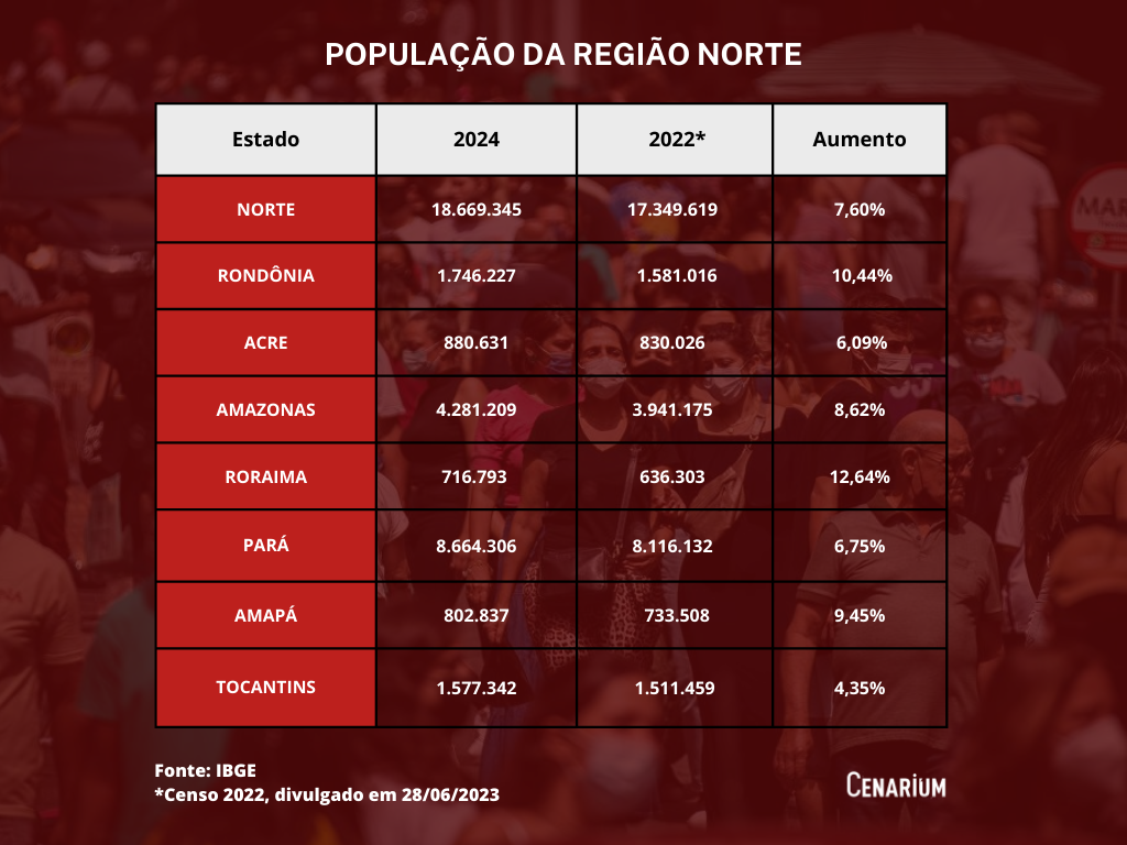 O Amapá teve um incremento populacional de 9,45%, passando de 733.508 para 802.837 habitantes. O Estado do Acre saiu de 830.026 para 880.631 pessoas, um aumento de 6,09%. Tocantins apresentou o menor crescimento populacional entre os sete Estados da Região Norte, com 4,35%, passando de 1.511.459, em 2022, para 1.577.342 indivíduos, na atualização de hoje.