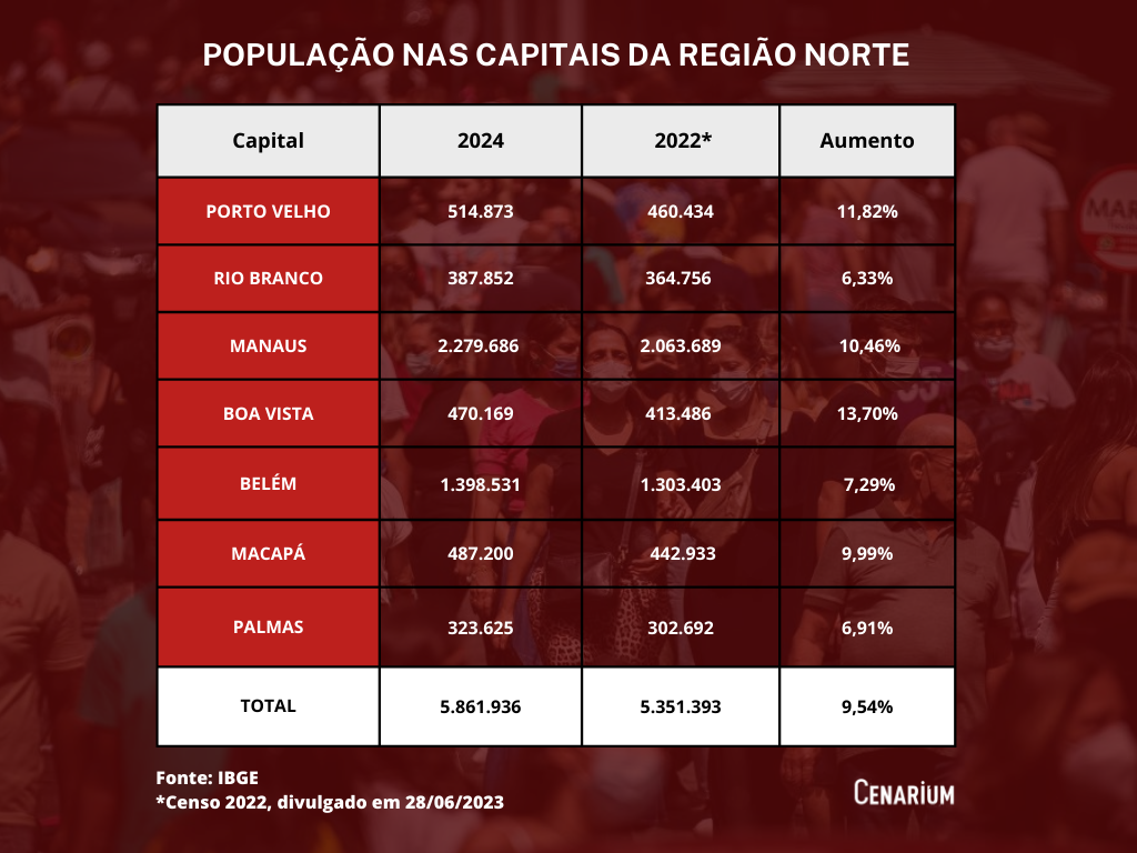Entre as sete capitais, o aumento populacional foi de 9,54%. No resultado do Censo 2022, divulgado em junho do ano passado, as cidades do Norte registraram uma população de 5.351.393 pessoas e, neste ano, passaram a 5.861.936.