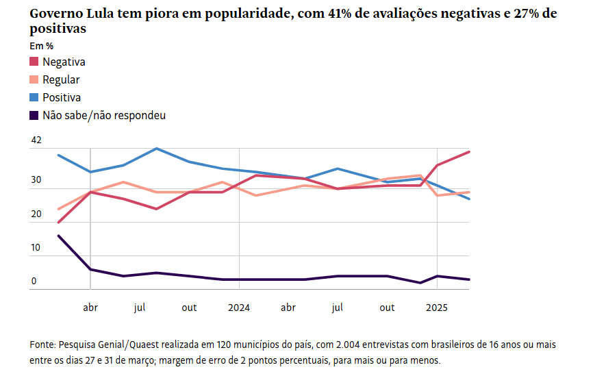 02 de abril de 2025MANAUS (AM) – A perda de popularidade do governo Lula (PT), iniciada com a crise do Pix, se acentuou, segundo indica pesquisa Genial/Quaest divulgada nesta quarta-feira, 2. Os dados apontam que a avaliação negativa do presidente aumentou, saindo de 37% em janeiro, mês do último levantamento, para 41%, enquanto as opiniões positivas tiveram queda de 31% para 27%. Também são 29% os que veem a administração como regular, ante 28%. Não sabem ou não quiseram responder 3%.