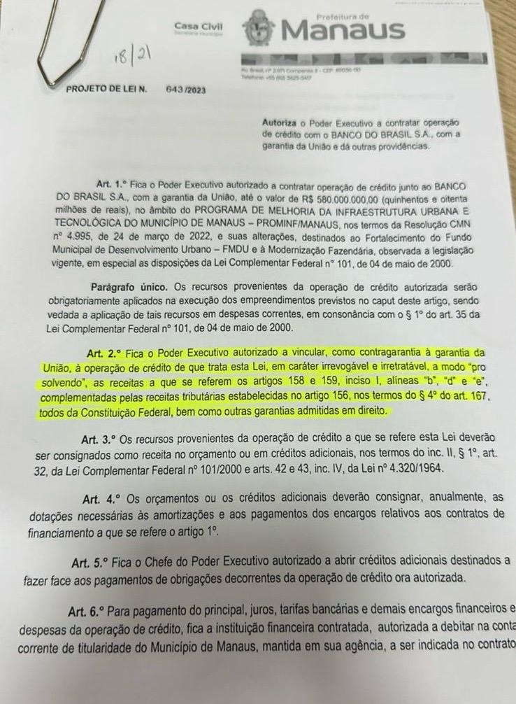 MANAUS (AM) – O empréstimo de R$ 580 milhões pleiteado pelo prefeito de Manaus, David Almeida (Avante), e aprovado na Câmara Municipal de Manaus (CMM) em 6 de dezembro de 2023, teve andamento suspenso no Legislativo por conta da falta de transparência na garantia de receitas da gestão municipal ao Banco do Brasil, instituição credora, que detectou o impasse em fevereiro deste ano. A análise foi feita pela Procuradoria da Casa nesta terça-feira, 16.