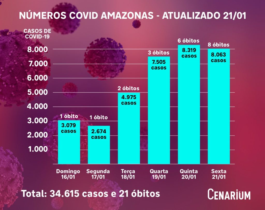 MANAUS — Levantamento feito pela CENARIUM com base nos boletins epidemiológicos da Fundação de Vigilância em Saúde (FSV-AM) e divulgado até esta sexta-feira, 21, mostra que o Amazonas registrou em seis dias 34.615 casos e 21 óbitos. A reportagem usou os dados de domingo, 16, até esta sexta-feira, 21. O Estado vive uma alta por conta da nova variante Ômicron.