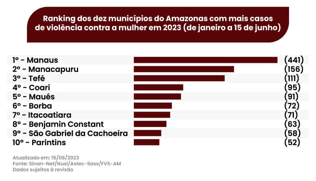 O ranking também inclui: Borba (72), Itacoatiara (71), Benjamin Constant (63), São Gabriel da Cachoeira (58) e Parintins (52). Dos quatro primeiros meses completos de 2023, o mês de março, em que se comemora o Dia Internacional da Mulher, foi o mais violento, com 396 notificações.